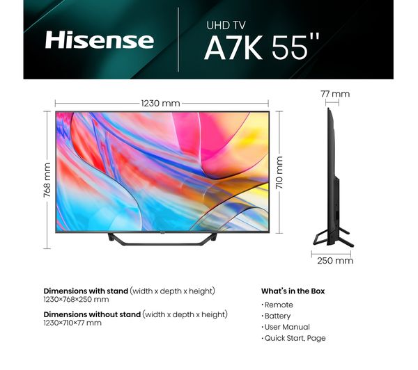 Technical specifications for HISENSE 55A7KQTUK 55″ Smart 4K Ultra HD HDR QLED TV with Amazon Alexa