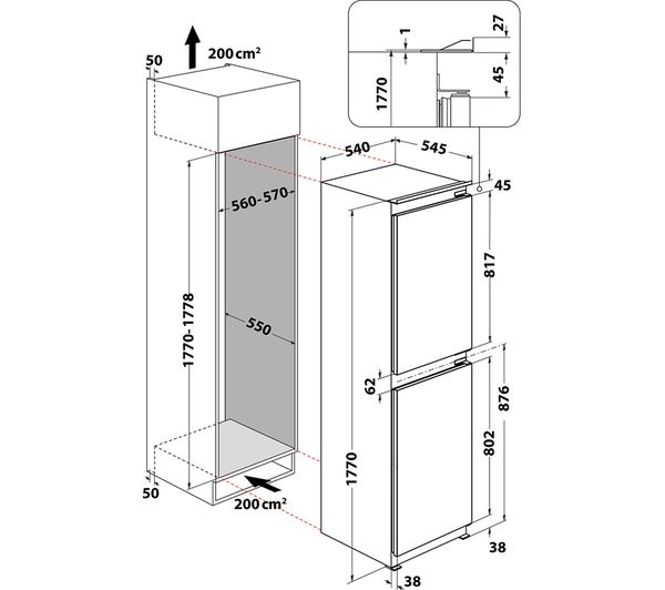 Technical specifications for INDESIT No Frost IBC18 5050 F2 Integrated 50/50 Fridge Freezer – Sliding Hinge