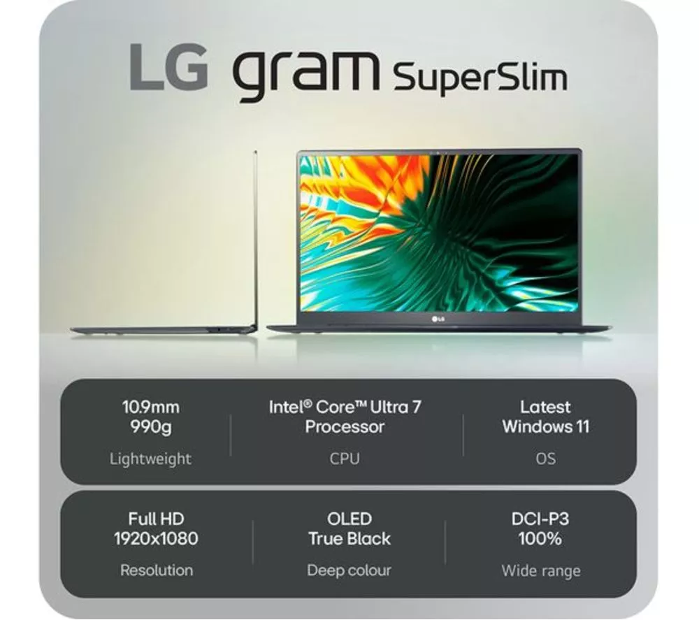 Technical specifications for LG gram SuperSlim 15Z90ST-G.AD78A1 15.6″ Refurbished Laptop – Intel® Core™ Ultra 7, 1 TB SSD, Dark Blue (Excellent Condition)