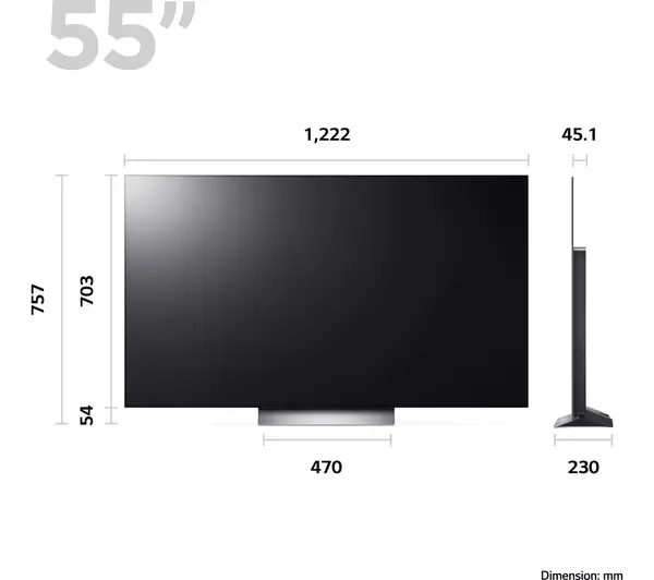 – TV with stand: 757 x 1222 x 230 mm (H x W x D)