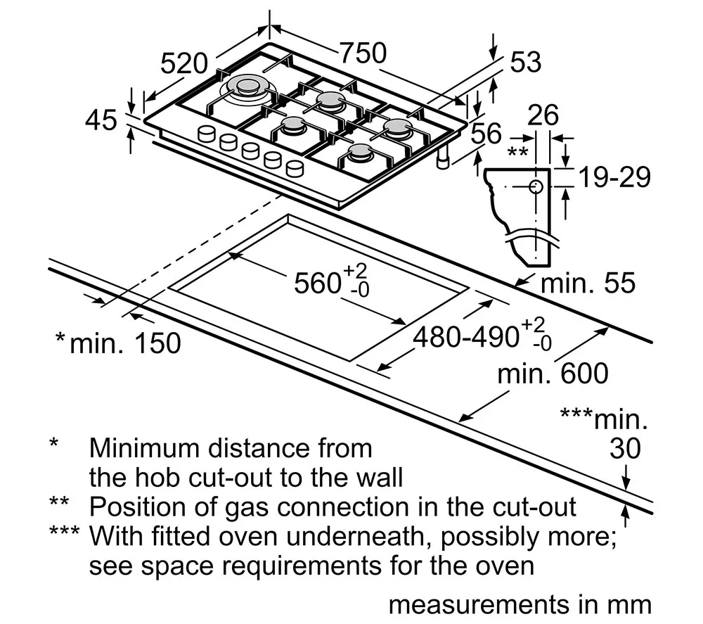 Minimum distance required / Minimum clearance above hob