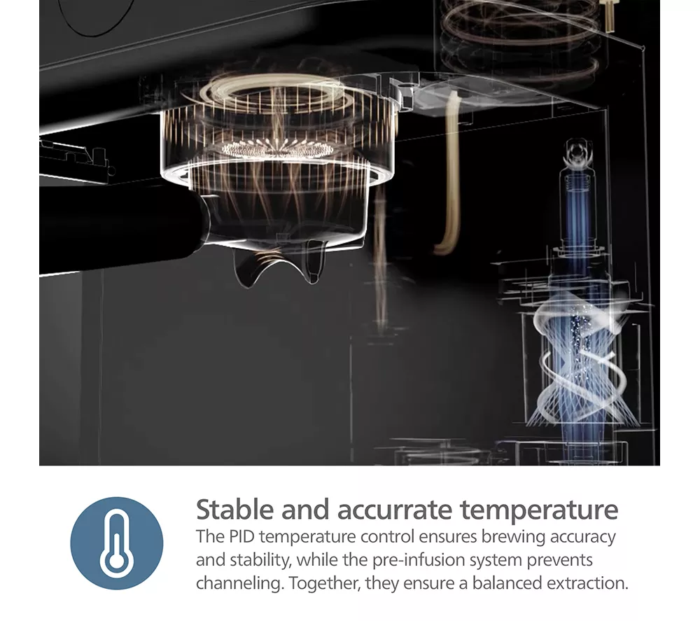 – PID temperature control and pre-infusion