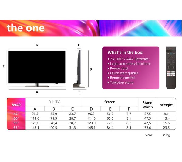 Technical specifications for PHILIPS The One Ambilight 50PUS8949/12 50″ Smart 4K Ultra HD HDR LED TV